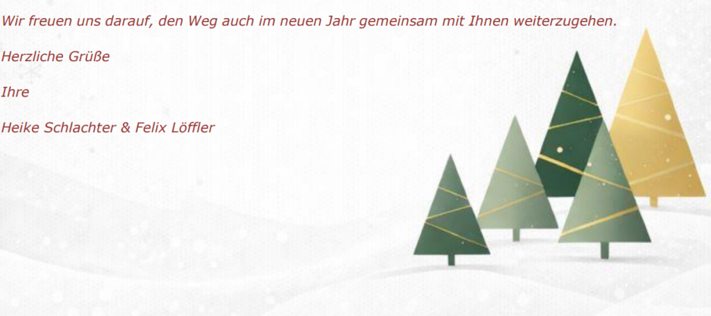 Wir wünschen Ihnen, Ihrem Team und Ihrer Familie entspannte Feiertage und einen guten Start in ein gesundes, erfolgreiches neues Jahr voller Zuversicht und starker Projekte.